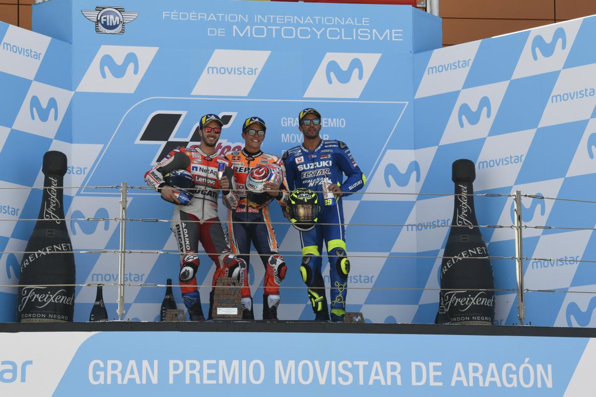 Marc Marquez mengalahkan Andrea Dovizioso dalam duel untuk memperebutkan posisi pertama dalam Grand Prix MotoGP Aragon 2018, sementara Jorge Lorenzo mengalami cedera kaki setelah terjatuh pada tikungan pertama selepas start.