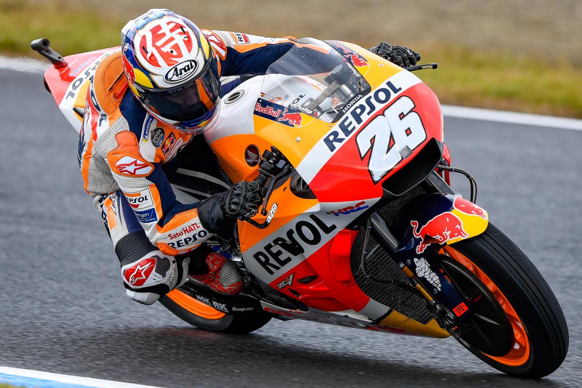Pembalap Honda Dani Pedrosa memimpin FP2 MotoGP Motegi 2018 dengan kondisi lintasan sebagian basah dan kering.