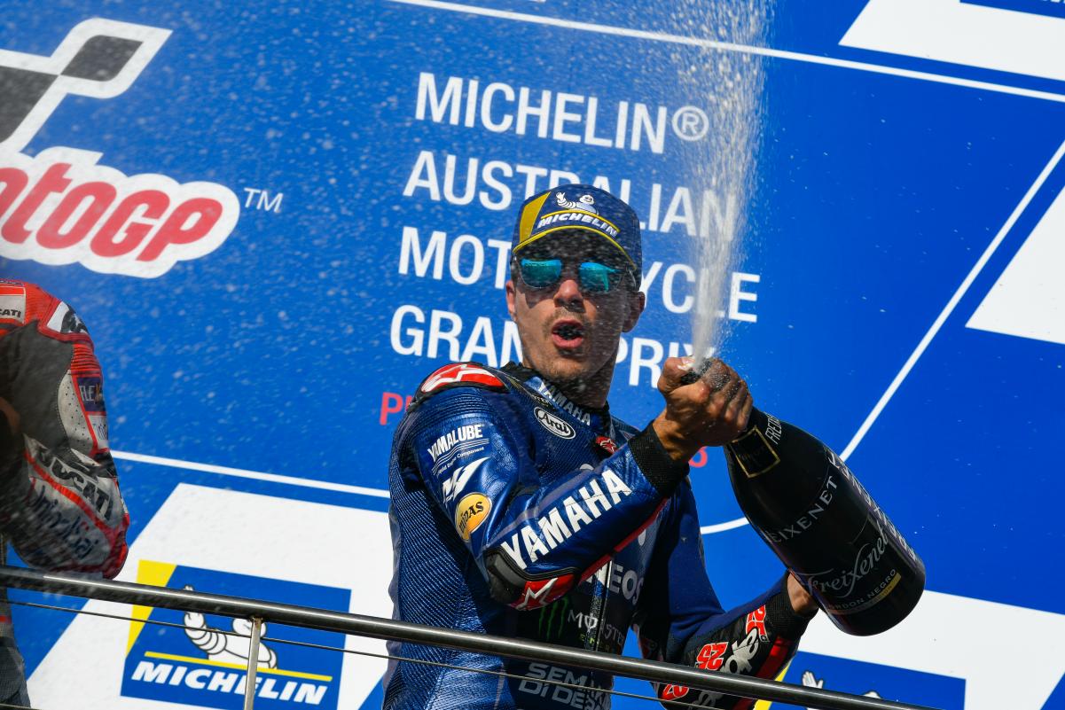 Maverick Vinales mematahkan 25 balapan tanpa kemenangan Yamaha dengan meyakinkan di Phillip Island, dan Johann Zarco beruntung lolos dari kecelakaan maut dengan Marc Marquez.