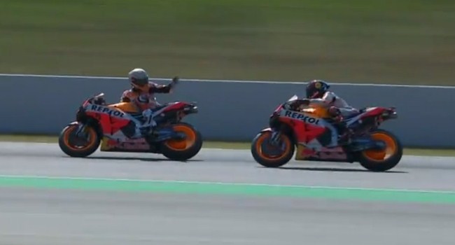 Marquez yang merasa terganggu saat berusaha mencetak lap tercepat kemudian menoleh ke belakang dan mengangkat tangannya sambil memarahi Lorenzo yang melaju di belakangnya.