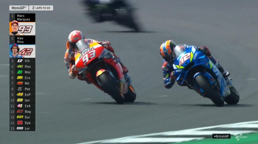 Alex Rins dengan sabar membuntuti, mengamati lalu menyerang dengan sangat mematikan rider Repsol Honda tepat di Tikungan akhir.