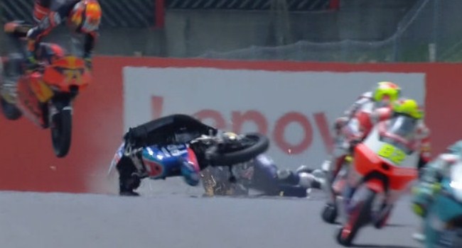 Sayanynya, dua pembalap lain yang melaju kencang dari belakangnya, yakni pembalap Jepang, Ayumu Sasaki (Red Bull KTM Tech3) dan rider Spanyol, Jeremy Alcoba (Indonesian Racing Team Gresini) tak sempat mengerem, karena kejadian sangat cepat.