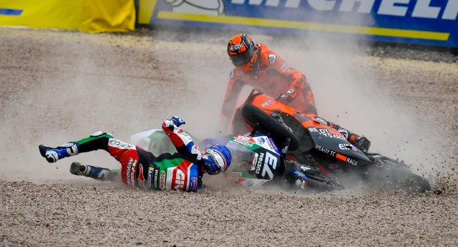 Alex terjatuh dan motornya kemudian ditabrak oleh Petrucci yang tak punya waktu untuk menghindar.