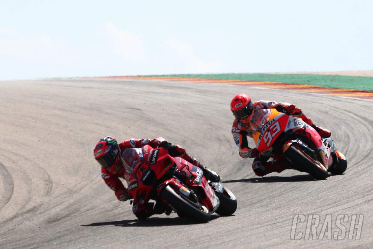 Francesco Bagnaia menahan Marc Marquez dengan gaya sensasional untuk meraih kemenangan MotoGP pertamanya di MotoGP Aragon.
