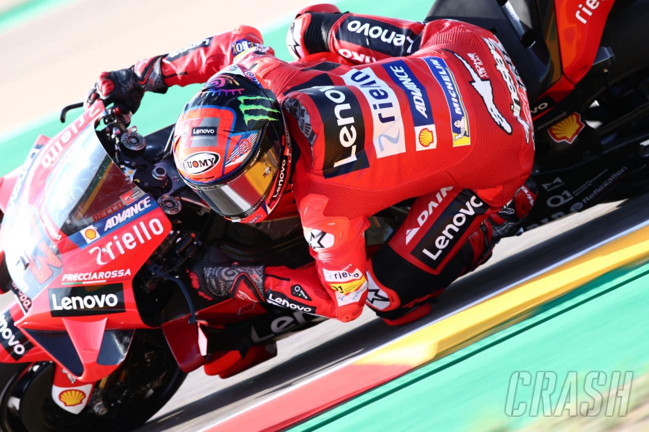 Pole-Sitter Francesco Bagnaia memimpin pemanasan pagi yang tertunda untuk MotoGP Aragon 2021. Sesi juga ditunda karena kabut tetapi, tidak seperti sesi Moto3 dan Moto2 yang dipersingkat, warm-up untuk MotoGP berlangsung selama 20 menit seperti biasanya.