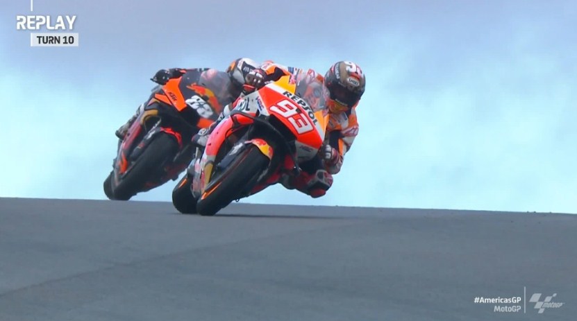 Miguel Oliveira (Red Bull KTM Factory Racing) vs Marc Marquez (Repsol Honda) Latihan Bebas 1 MotoGP Austin, Amerika Serikat 2021 / NontonMotoGP © Twitter/MotoGP.