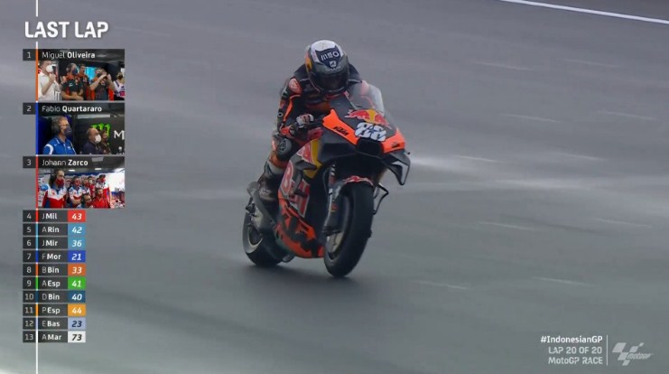 Oliveira melintasi garis finis balapan hujan Mandalika dengan keunggulan 2.205 detik di depan juara dunia bertahan, Fabio Quartararo (Monster Energy Yamaha) yang finis