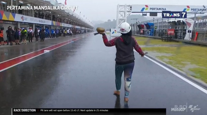 Sembari menunggu hujan reda, perhatian MotoGP tertuju pada seorang yang disebut sebagai ‘Pawang Hujan’, yang diizinkan berjalan bahkan melintasi Pit-lane.