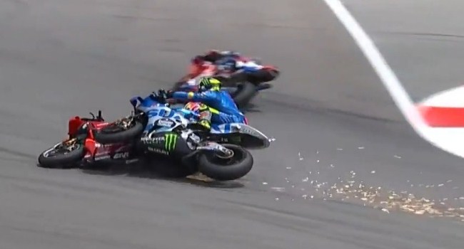 Miller terjatuh ketika sejajar di sisi dalam dengan Mir, rider Suzuki Ecstar itu tidak dapat menghindar karena sangat berdekatan.