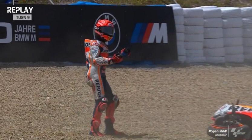 Marc Marquez terjatuh dua kali dalam satu lap sesi Latihan Bebas MotoGP Spanyol, tersungkur di Tikungan 6 Jerez karena ban depan, kemudian jatuh lagi di Tikungan sembilan karena keluar racing line.