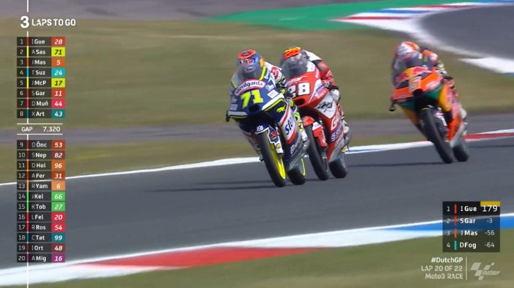 Lengkapi podium tiga di balapan terakhir paruh pertama ini, hadir rider Spanyol lainnya, Sergio Garcia (Valresa GASGAS Aspar Team) dengan selisih waktu +0.392 detik.