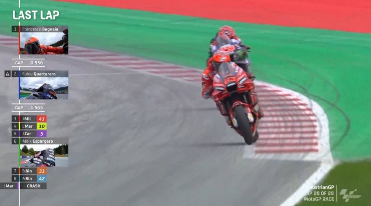 Luca Marini (Mooney VR46 Racing) dan Johann Zarco (Prima Pramac Racing) masing-masing finis keempat dan kelima.