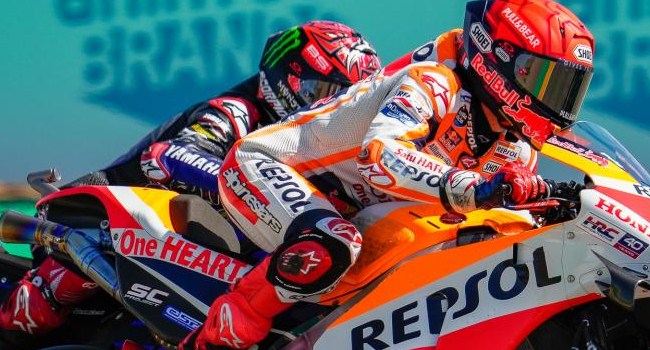 Pertama di Tikungan 3 yang melibatkan rider Prancis, Fabio Quartararo dan pembalap Spanyol, Marc Marquez.