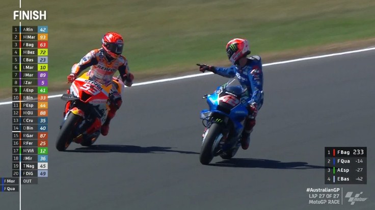 Marquez kalah di lap terkahir ketika tak berdaya menghadapi Rins dengan pertahanan baik.