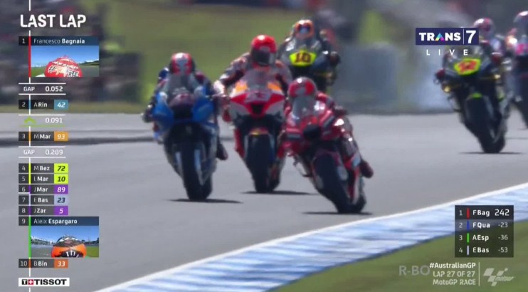 Sayangnya, serangan dari pembalap Spanyol, Alex Rins di Tikungan 2 lap terakhir kepada rider Ducati Lenovo itu mengubah segalanya.