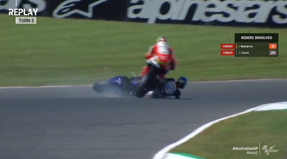 Navarro terjatuh di racing line, tepat di depan pembalap Italia, Simone Corsi yang tak dapat menghindar.