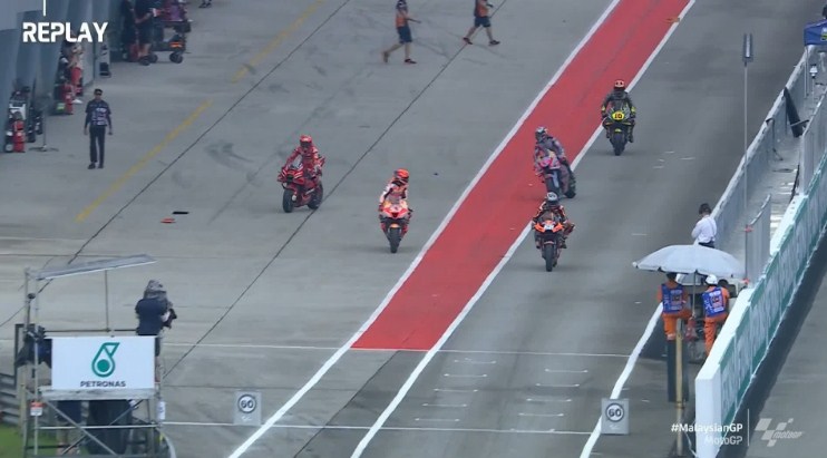 Dalam sesi FP3 MotoGP Malaysia, beberapa pembalap beriringan memasuki sirkuit, termasuk dua diantaranya adalah Bagnaia dan rider Satelit Gresini Racing, Enea Bastianini.