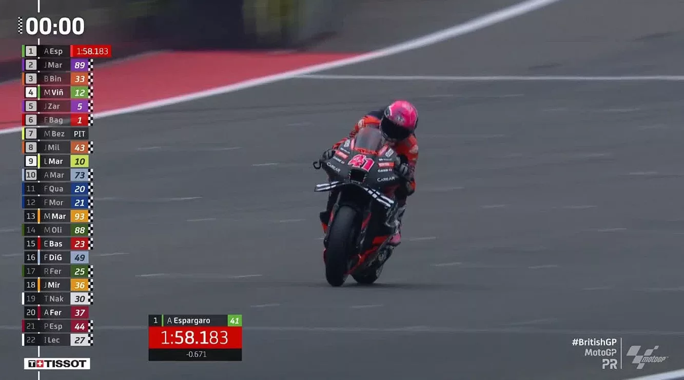 Silverstone, NontonMotoGP — Rider asal Soanyol, Aleix Espargaro memimpin sesi Latihan MotoGP Inggris, Jum’at (4/8) di sore hari.