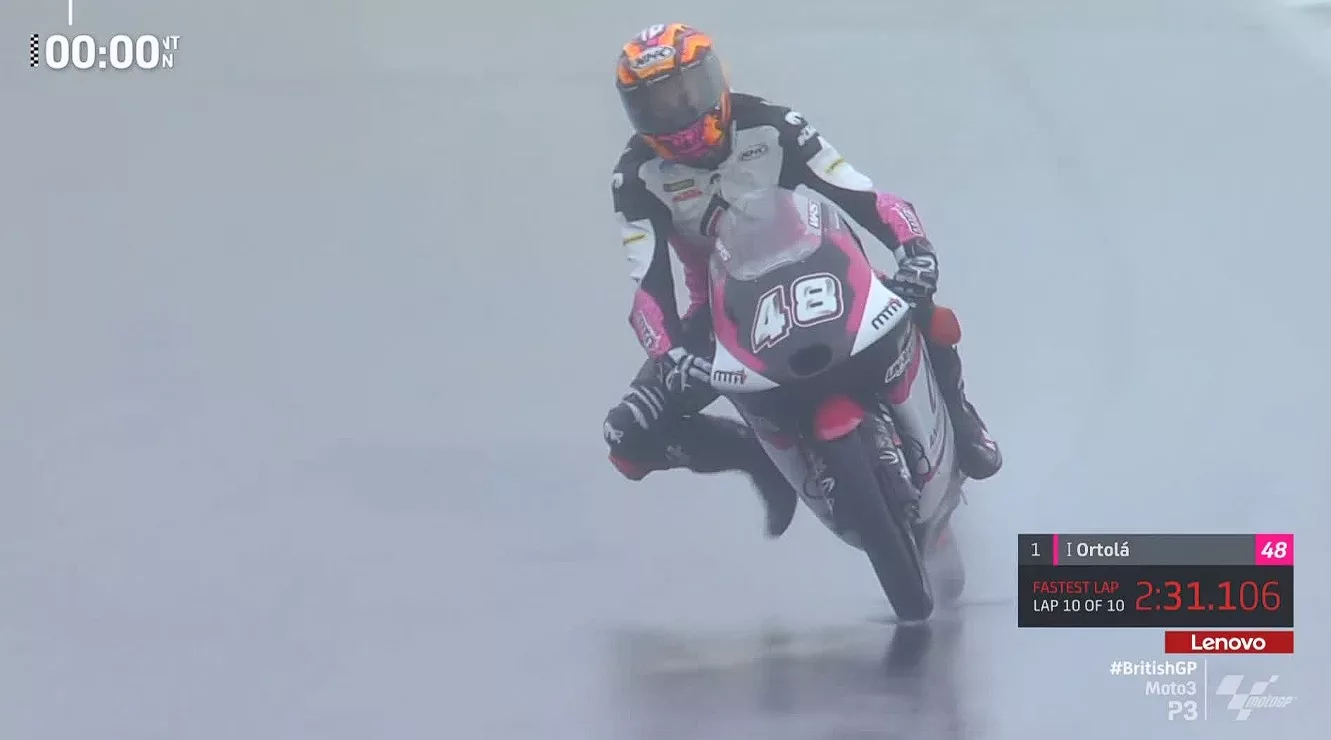 Ivan Ortola memimpin sesi Laltihan 3 Moto3 Inggris dalam konsisi hujan, Mario Aji ke-22.