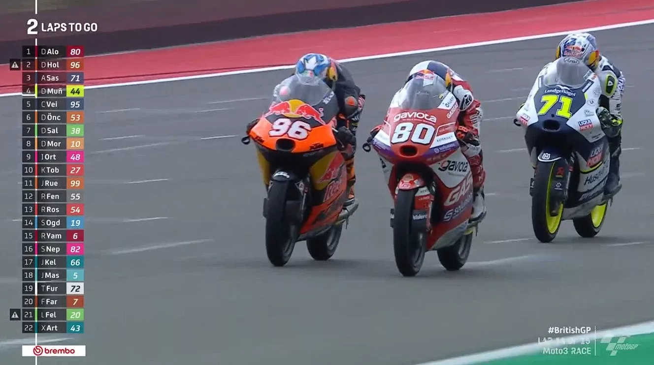 David Alonso berhasil mengalahkan Ayumu Sasaki dan Daniel Holgado dalam balapan Moto3 Inggris di sirkuit Silverstone.
