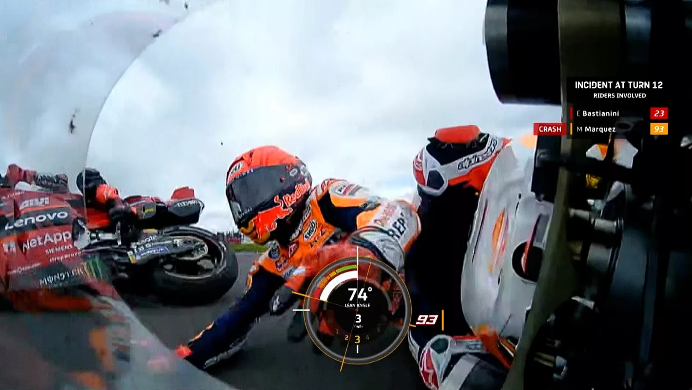 Pembalap Repsol Honda itu menghindari titik basah sirkuit Silverstone, membuatnya berada di tempat yang sama dengan Bastianini, kemudian dia terjatuh.