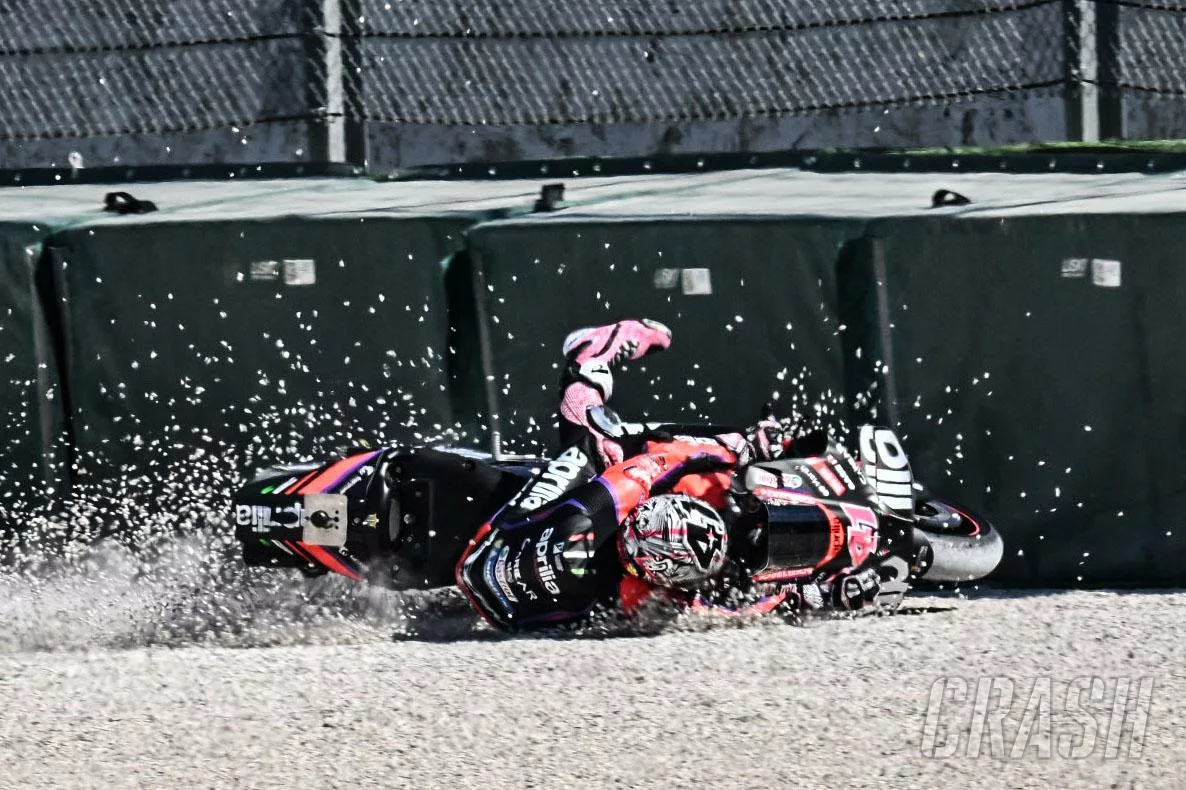“Saya sedang mencoba rangka baru. Saya kehilangan kontrol di tikungan 13. Saya langsung menuju tembok. Itu sangat menyeramkan… Itu bukan kecelakaan sebenarnya. Saya meluncur, sangat cepat dan untuk menghindari tembok, saya melompat keluar dari motor.”
