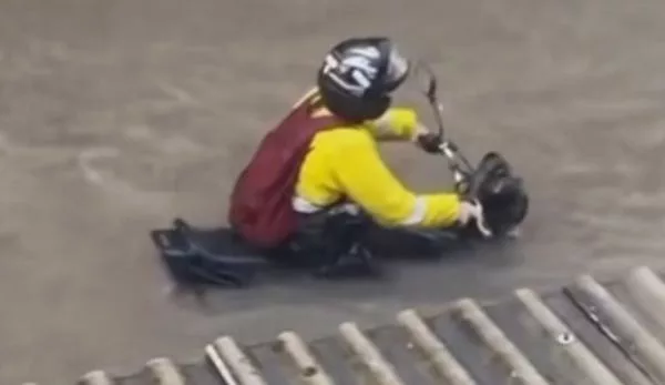 Dalam video yang diunggah akun Instagram @humanonwheels, terlihat seorang pengendara motor yang diduga jenis motor sport 150cc terdorong arus air banjir. Meskipun ketinggian air cukup tinggi dan hanya menampilkan bagian tangki dan tempat duduk motor, sang pemotor tetap terlihat tenang dan mengikuti arus air dengan santai.