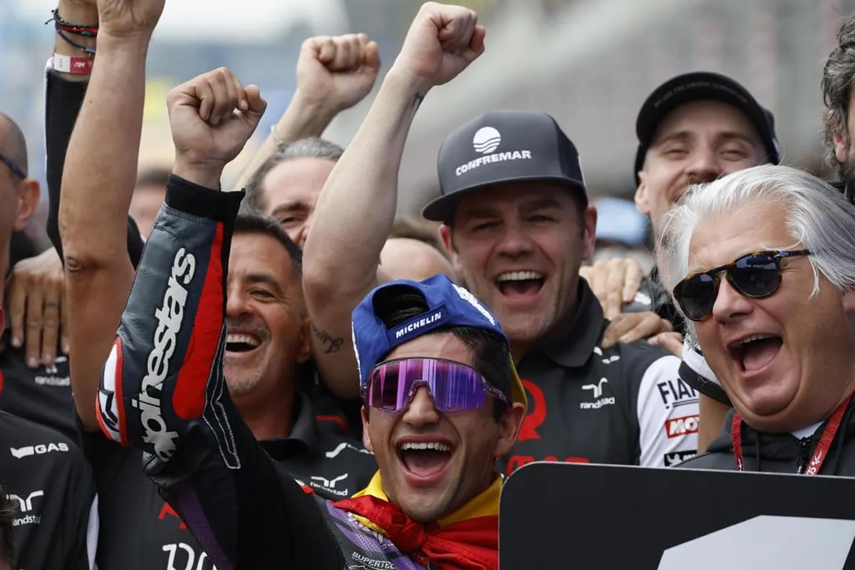 Pada suatu hari di Le Mans, suasana di box tim Prima Pramac begitu meriah. Gigi Dall’Igna, CEO Ducati Corse, datang untuk merayakan kemenangan dengan segelas bir di tangan dan berkas data di bawah lengannya. Begitu sang bos pergi, suasana semakin riuh: musik keras dari The Prodigy menggema, teriakan dan kegembiraan merayap di seluruh ruangan.